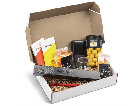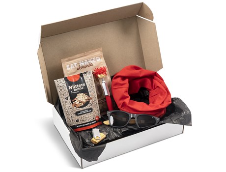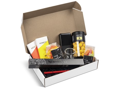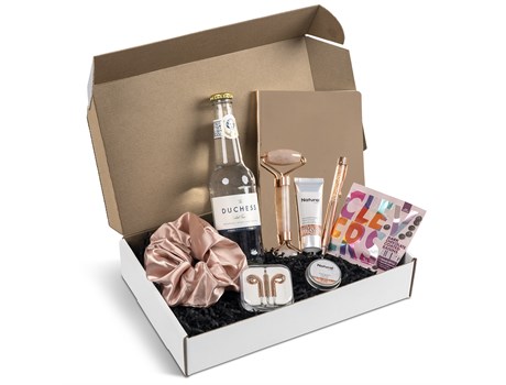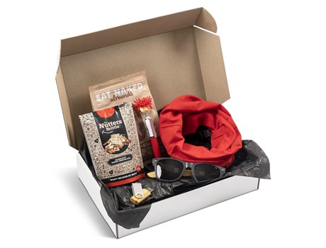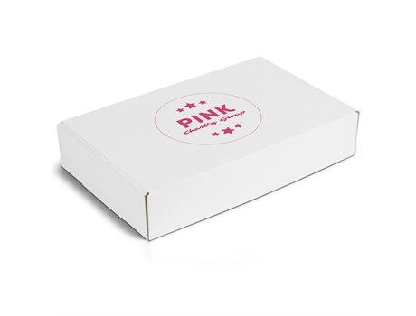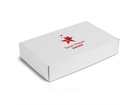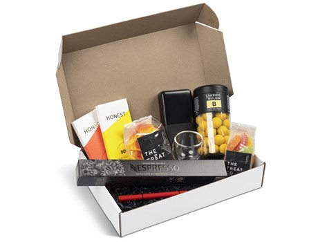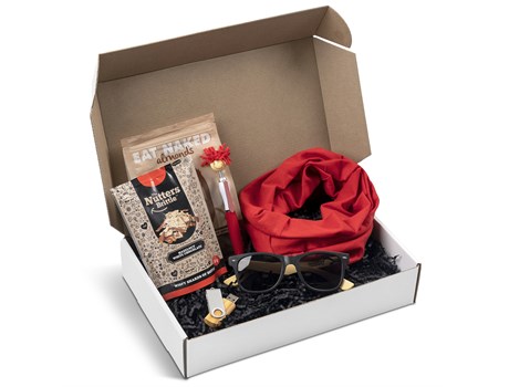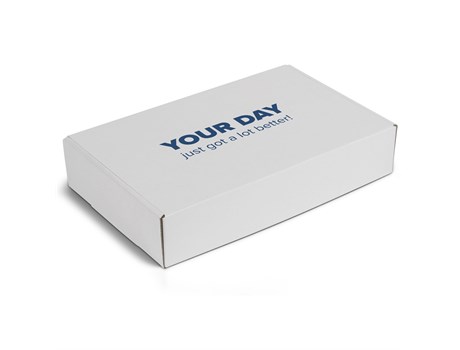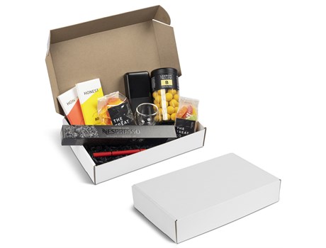 Consider creating your own gift set by packaging items together in a gift box branded with your logo or message. You can also add shredded paper filler or tissue paper to your gift set. Simple 1-colour, 1-position branding is available on this white box. If you’d like larger coverage, full-colour branding, then please consider the PG-AM-406-B natural kraft box.