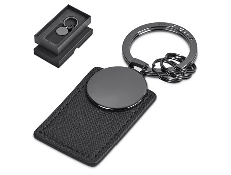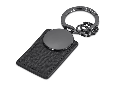 The Alex Varga collection presents a selection of understatedly elegant keyholders featuring gun metal finish zinc alloy parts, combined with a textured PU. This model can be laser branded on both the plate and the PU section of the keyholder.