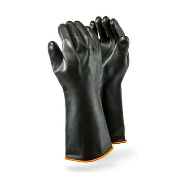 Dromex® H1-40 and H2 heavy duty black and orange unlined natural rubber latex gloves are thicker than regular latex gloves making them considerably more durable with high elasticy whilst providing increased protection against punctures and abrasion. These gloves are available in different lengths with an option of either a smooth and crinkled palm finish. Crinkled finish palm and fingers are especially good for grip in wet and oily applications such as handling and assembling of small oily parts and general assembly. The rolled cuffs prevent glove rolldown/rollback and provides drip protection for the forearm. Suitable for use in industrial environments such as mines, hardwares, construction, plumbing and material handling as well as mechanical industries. These thick natural latex gloves are designed to protect hands and arms for special jobs such as chemical disposal and contact, handling laboratory experiment, unidentified liquid and powder recycle and examination, corpse transportation, agricultural pesticide, plywood manufacturing, work in plague zone, fishing, etc.