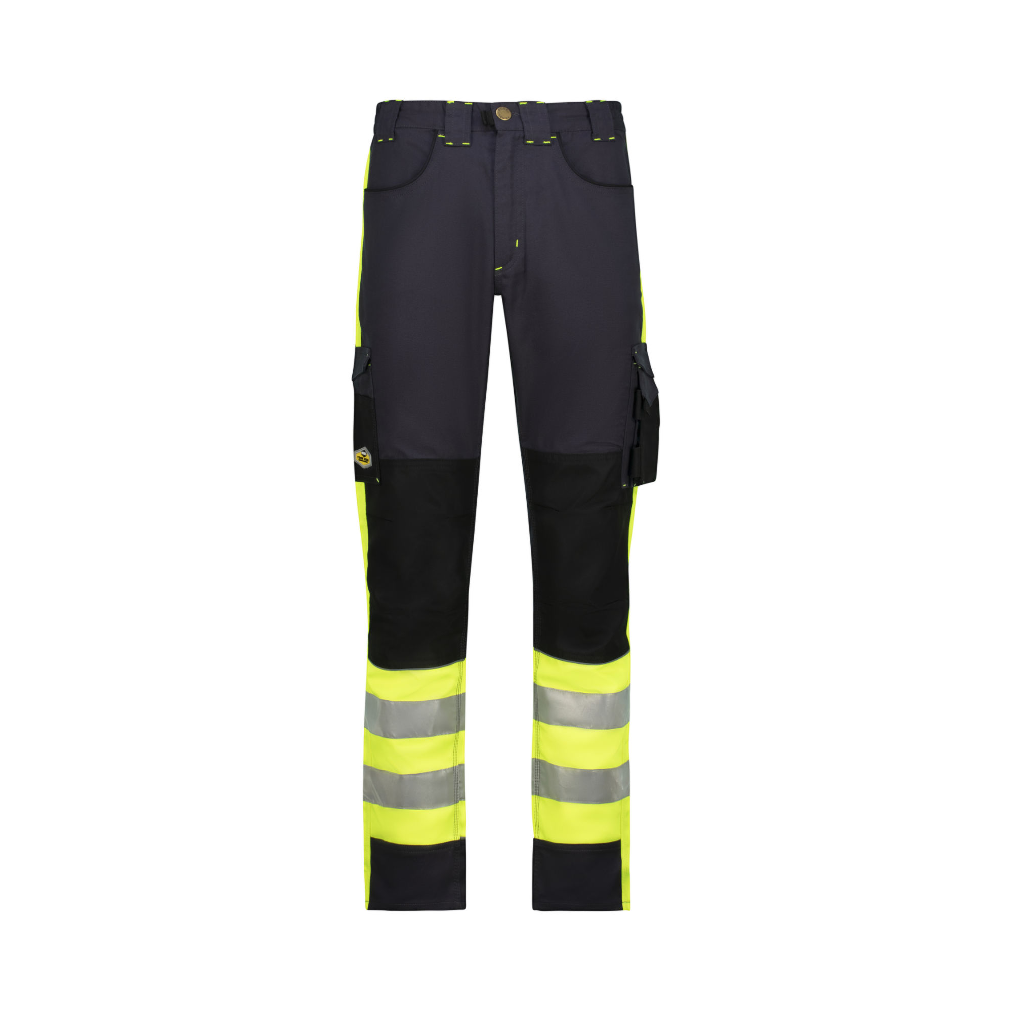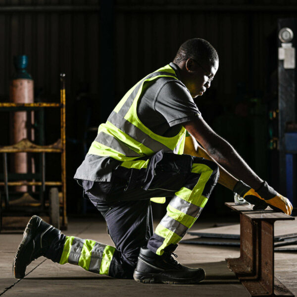 Stay visible, stay protected. The NightGlo Lime and Gun Metal Tech Gear Trousers are built for durability, comfort, and enhanced visibility. Crafted from a rugged polycotton blend with added spandex for flexibility, these trousers offer seven utility pockets, triple-stitched seams, and reinforced knees for long-lasting performance. The hi-visibility lime fabric, combined with 50mm reflective tape and silver reflective piping, ensures you stand out in low-light conditions. A stretch waist, functional tool loop, and heavy-duty overlays make them the perfect choice for demanding work environments.